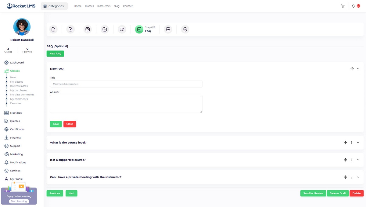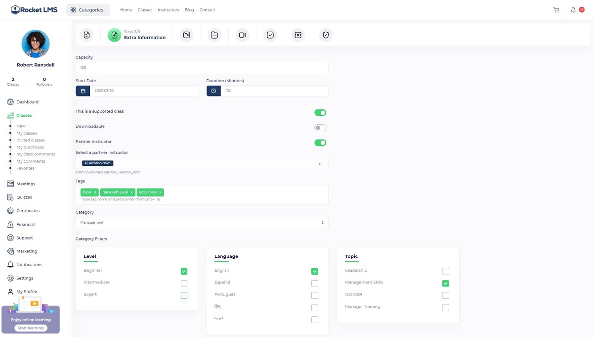 Partner instructor: If you want to invite another instructor to your course, you should turn this toggle on so the partner instructor dropdown will be displayed and you will be to add single or multiple instructors to the course. The invited instructor profile will be displayed on the course page and the invited instructor will be able to view the course through the “Instructor panel/ Classes/ Invited classes”.