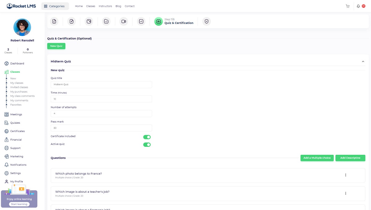 Description: The class description that will be displayed on the class page includes all of the information about the course educational material, instructor, and other related information that will motivate viewers to enroll in the course. We suggest writing at least 300 words for this page because it is one of the most important SEO requirements.