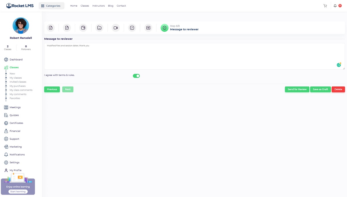 In this step, the instructor should agree on terms and rules. If there are important points for a reviewer, the instructor can write them in the message field.